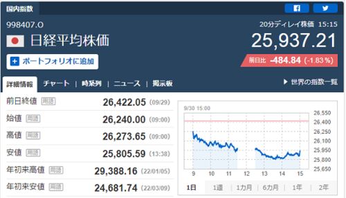 日経平均220926 Yahoo!ファイナンスより 大きく下げたね。アメリカでも株安が進行しているみたいだし、27,000円台もあっさり割り込んだ。それどころか26,000円台もキープできるか怪しい雰囲気だね。こりゃいよいよ本格的な暴落がやって来たかな? 今日は関電…